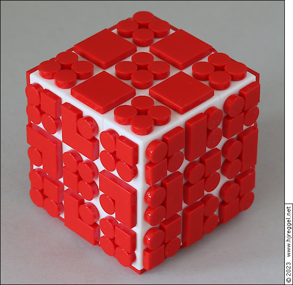 This is the second version if the previously shown "Red Dots Cube". Now, adjacent squares are replaced by 1×2 tiles and 2×2 L shaped tiles to minimize the possibility of twists.