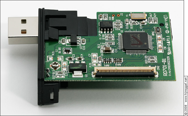 The harddisk is actually from a LaCie little disk Mini Portable Storage, that I would call a masterpiece of product design failure: The box of 68.2 × 44.1 × 18.0mm³ is about 7× the volume of the bare disk, and uses the PATA version of the disk with PATA to USB PCB (NEC µPD720133GB), although Samsung also offers models with native USB support. I can't see any reason why a manufacturer would add so much cost to a product, unless the native USB interface would have some serious bandwith limitation or compatiblity issues.