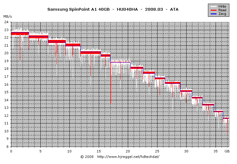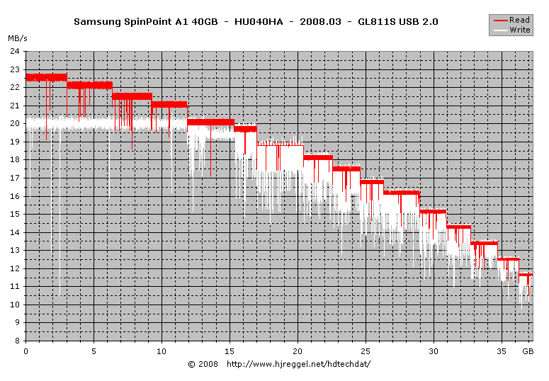 The read performance is excellent with distinct and clean media zones. The 21MB/s write during the first two media zones are most likely limited by the PATA to USB bridge. The rest of the write is influenced by timing problems, but still OK.